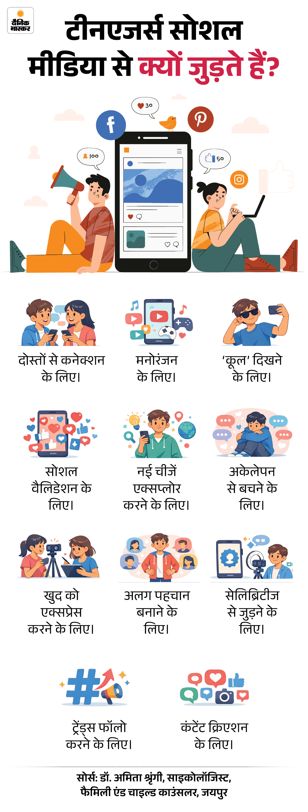 टीनएज में ‘सोशल वैलिडेशन’ बहुत मायने रखता है। वहीं सोशल मीडिया टीनएजर्स को एक ऐसा मंच देता है, जहां वे अपनी पहचान बना सकते हैं और अपनी पसंद की चीजों को दुनिया के साथ साझा कर सकते हैं। यह उनके लिए केवल मनोरंजन नहीं, बल्कि एक वर्चुअल दुनिया है, जहां वे अपने अस्तित्व को तलाशते हैं।