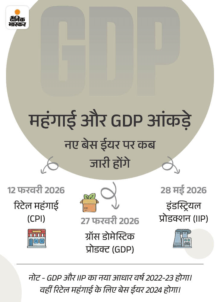 GDP और IIP के लिए नया आधार वर्ष 2022-23 होगा। वहीं रिटेल महंगाई के लिए बेस ईयर 2024 होगा। मिनिस्ट्री ऑफ स्टेटिस्टिक्स एंड प्रोग्राम इंप्लिमेंटेशन (MoSPI) ने इसकी तैयारी पूरी कर ली है।