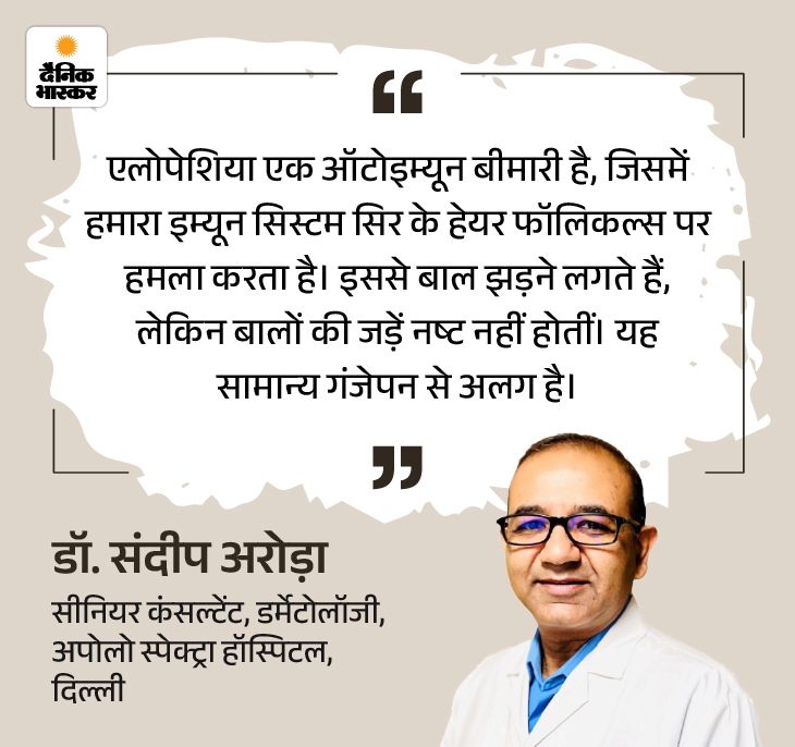 जवाब- एलोपेशिया एक ऐसी कंडीशन है, जिसमें शरीर का इम्यून सिस्टम गलती से अपने ही हेयर फॉलिकल्स (बालों की जड़) पर हमला करने लगता है।