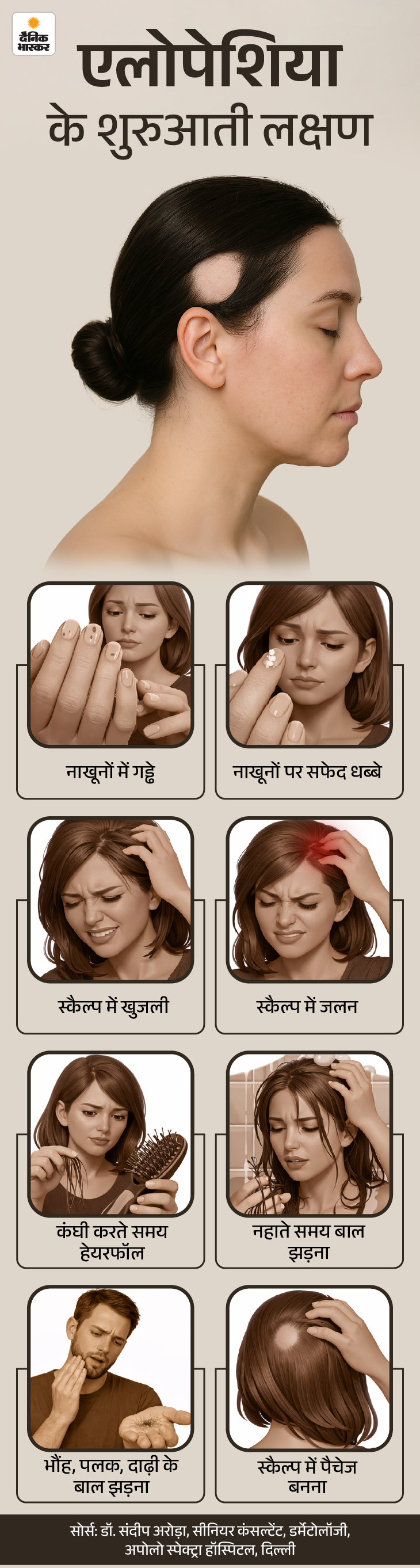 कुछ मामलों में नाखूनों पर गड्ढे, खुरदरापन या सफेद धब्बे भी दिख सकते हैं। शुरुआत में दर्द नहीं होता। इसलिए लोग इसे सामान्य हेयर फॉल समझकर नजरअंदाज कर देते हैं। लेकिन समय पर बीमारी की शिनाख्त इलाज को ज्यादा कारगर बना सकती है।
