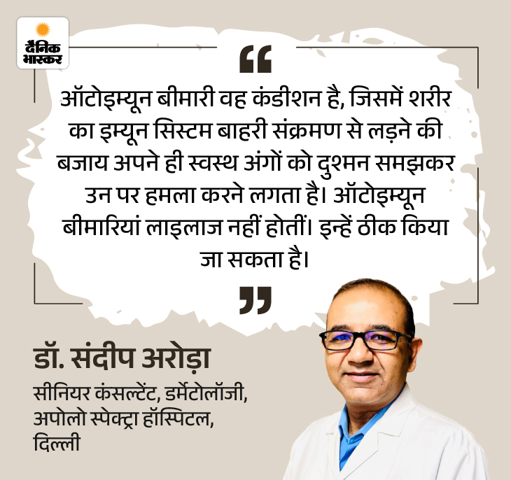 जवाब- लूपस, हाशिमोटो (एक प्रकार की थायरॉइड कंडीशन) और रुमेटॉइड आर्थराइटिस की तरह ही एलोपेशिया भी एक ऑटोइम्यून बीमारी है। इसके कारण बॉडी में इंफ्लेमेशन होता है। फिर सेल्स और ऑर्गन्स सही तरीके से काम नहीं करते हैं। ऑटोइम्यून बीमारियां संक्रामक नहीं होतीं, लेकिन ये क्रॉनिक (लंबे समय तक रहने वाली बीमारी) होती हैं।