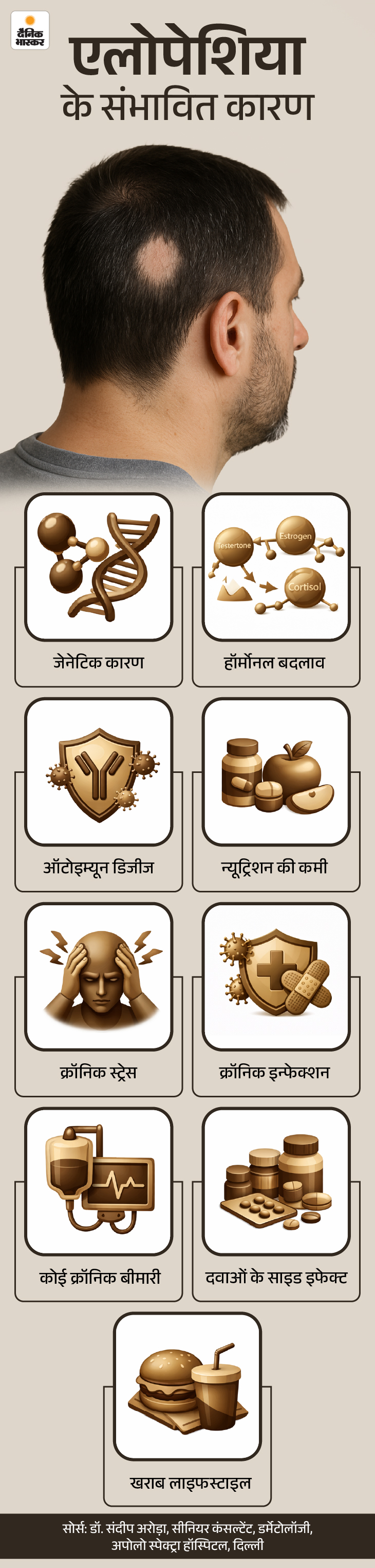 जवाब- एलोपेशिया का मुख्य कारण इम्यून सिस्टम का असंतुलन है। इसके पीछे जेनेटिक कारण, तनाव, वायरल इंफेक्शन, हॉर्मोनल बदलाव और अन्य ऑटोइम्यून बीमारियां जिम्मेदार हो सकती हैं।