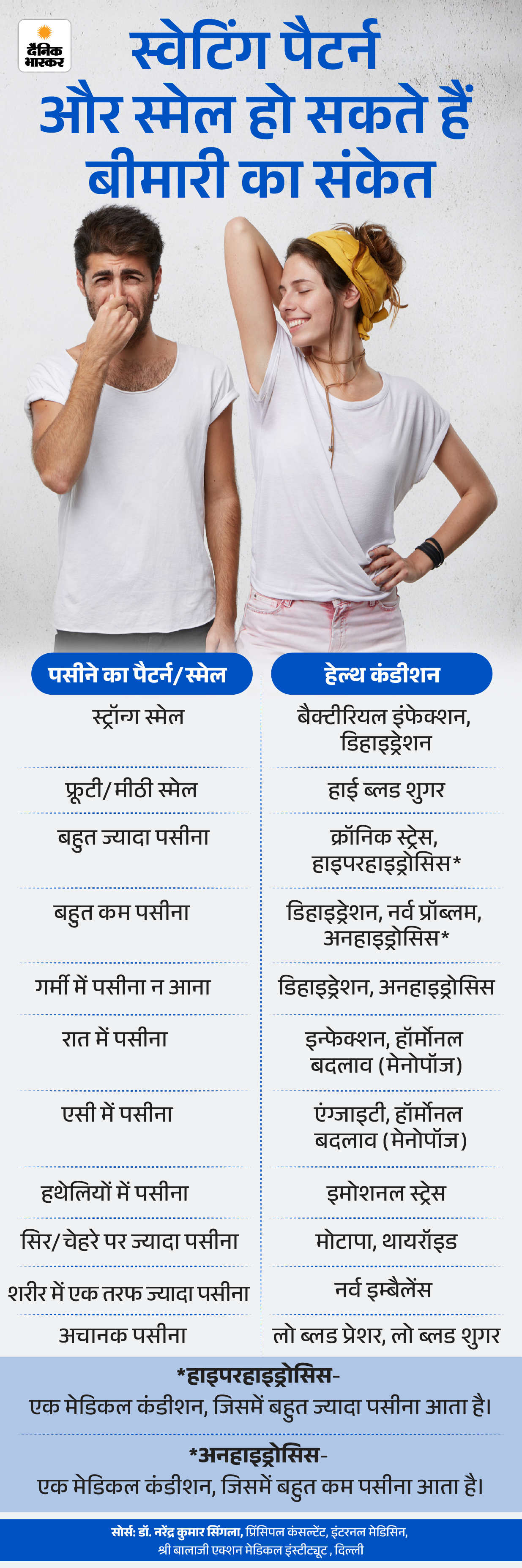 जवाब- पसीने का पैटर्न और उसकी स्मेल कई हेल्थ रिस्क का संकेत दे सकती है। अलग-अलग संकेत क्या बताते हैं, ग्राफिक में देखिए-