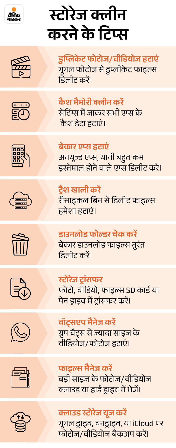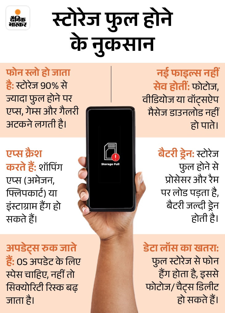 फेस्टिव सीजन में स्मार्टफोन फोटोज, वीडियोज और शॉपिंग एप्स से भर जाता है। स्टोरेज फुल होने से फोन स्लो हो जाता है, एप्स क्रैश करते हैं, बैटरी जल्दी खत्म होती है और नई फाइल्स सेव नहीं हो पातीं। यहां तक कि डेटा लॉस होने का खतरा रहता है।