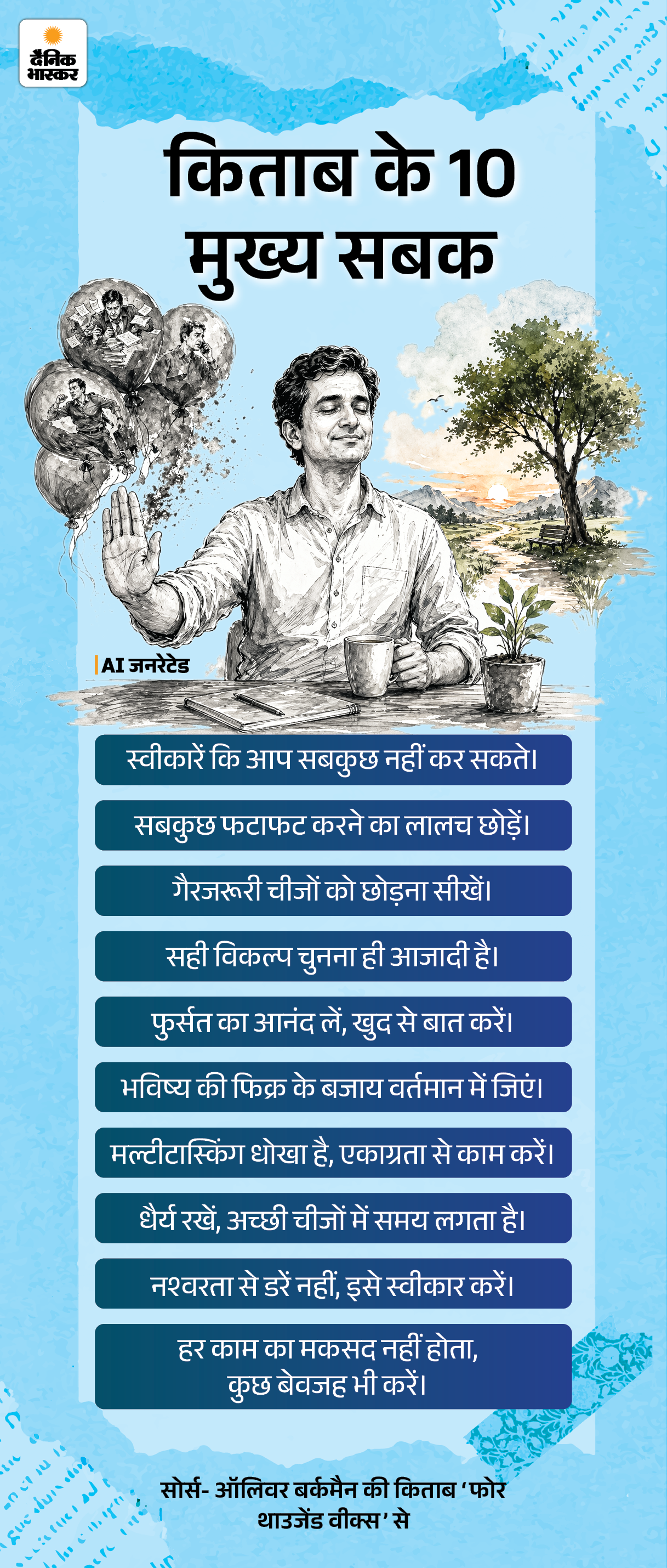 यह किताब ‘हसल कल्चर’ (हर वक्त भागने की संस्कृति) के खिलाफ एक मैनिफेस्टो है। यह उनके लिए है, जो हर समय ‘बिजी’ रहते हैं और फिर भी उन्हें लगता है कि वे जीवन में कुछ सार्थक नहीं कर रहे हैं। नीचे दिए ग्राफिक से किताब के मुख्य सबक समझिए-