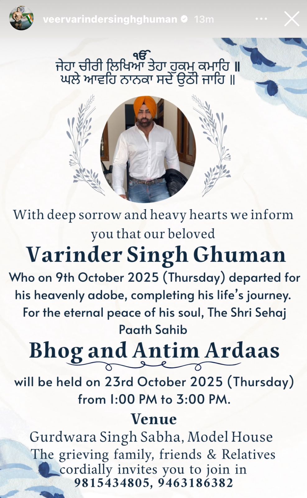 बीते मंगलवार को परिवार द्वारा जानकारी साझा की गई। जारी की गई पोस्ट में कहा गया है कि वरिंदर सिंह घुम्मन का नाम की अंतिम अरदास गुरुवार को मॉडल हाउस स्थित गुरुद्वारा साहिब में संपन्न की जाएगी। अंतिम अरदास (भोग) में कई कलाकारों और राजनेताओं के पहुंचने की उम्मीद है।