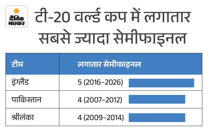 इंग्लैंड टी-20 वर्ल्ड कप में लगातार पांचवीं बार सेमीफाइनल में पहुंच गया है। टीम 2016 से 2026 तक लगातार पांच बार सेमीफाइनल में पहुंची है। इससे पहले पाकिस्तान और श्रीलंका चार-चार बार लगातार अंतिम चार में पहुंचे थे, लेकिन इंग्लैंड अब इस मामले में सबसे आगे निकल गया है।