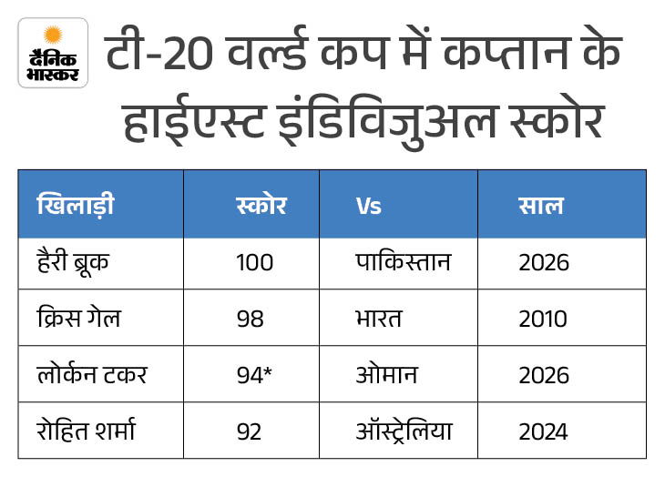 हैरी ब्रूक ने कप्तान रहते हुए पाकिस्तान के खिलाफ 100 रन की पारी खेलकर इतिहास रच दिया। वह टी-20 वर्ल्ड कप में शतक लगाने वाले पहले कप्तान बने। इससे पहले क्रिस गेल का 98 रन सर्वोच्च स्कोर था। ब्रूक टी-20 वर्ल्ड कप रन चेज में शतक लगाने वाले चौथे बल्लेबाज भी बने।