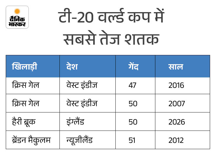 हैरी ब्रूक ने 50 गेंदों में शतक लगाकर टी-20 वर्ल्ड कप इतिहास का दूसरा सबसे तेज शतक जड़ा। वह सिर्फ क्रिस गेल (47 गेंद) से पीछे हैं। साथ ही ब्रूक इंग्लैंड के लिए तीनों फॉर्मेट में शतक लगाने वाले तीसरे खिलाड़ी भी बने। उनसे पहले जोस बटलर, डेविड मलान ऐसा कर चुके हैं।