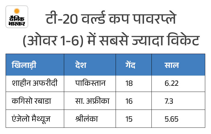 शाहीन अफरीदी नई गेंद से टी-20 वर्ल्ड कप इतिहास के सबसे खतरनाक गेंदबाज साबित हुए हैं। उन्होंने पावरप्ले में 18 विकेट लेकर इस फेज में सबसे ज्यादा विकेट लेने का रिकॉर्ड बनाया।