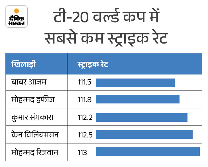 टी-20 वर्ल्ड कप में जहां बल्लेबाजों से तेज रन बनाने की उम्मीद होती है, वहीं बाबर आजम का स्ट्राइक रेट 111.5 रहा है, जो 500 से ज्यादा रन बनाने वाले खिलाड़ियों में सबसे कम है। इस लिस्ट में हफीज, संगकारा और विलियमसन जैसे बड़े नाम भी हैं, लेकिन बाबर सबसे नीचे हैं।