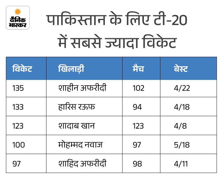 पाकिस्तान के लिए टी-20 इंटरनेशनल में सबसे ज्यादा विकेट लेने का रिकॉर्ड अब शाहीन अफरीदी के नाम है। उन्होंने 102 मैचों में 135 विकेट लेकर हारिस रऊफ को पीछे छोड़ा, जिनके नाम 133 विकेट हैं। शादाब खान तीसरे स्थान पर हैं, जबकि मोहम्मद नवाज और दिग्गज ऑलराउंडर शाहिद अफरीदी भी इस सूची में शामिल हैं।