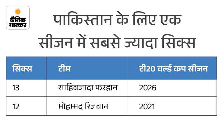 पाकिस्तान के लिए एक टी-20 वर्ल्ड कप सीजन में सबसे ज्यादा सिक्स लगाने का रिकॉर्ड अब साहिबजादा फरहान के नाम हो गया है। उन्होंने 2026 एडिशन में 13 छक्के जड़कर मोहम्मद रिजवान का रिकॉर्ड तोड़ा, जिन्होंने 2021 सीजन में 12 सिक्स लगाए थे।