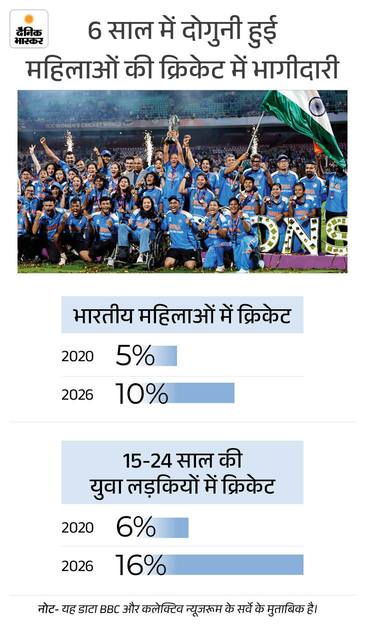 बीबीसी और कलेक्टिव न्यूजरूम की ओर से कराए गए इस सर्वे में 10 हजार से ज्यादा महिलाओं को शामिल किया गया। इसमें पाया गया कि 2020 में जहां सिर्फ 5% महिलाओं ने क्रिकेट खेलने की बात कही थी, अब यह आंकड़ा बढ़कर 10% हो गया है।
