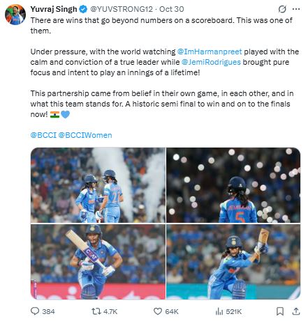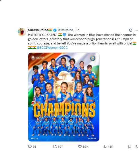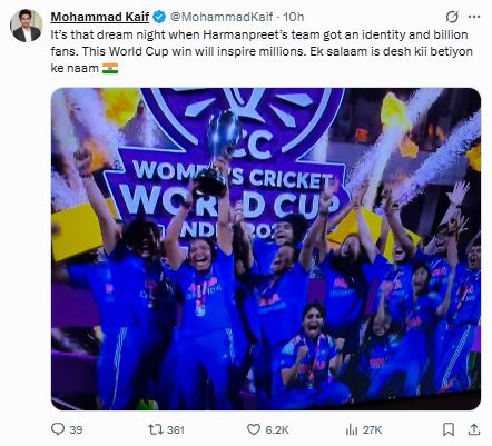 मोहम्मद कैफ ने अपने एक्स अकाउंट पर लिखा, यह वो सपनों वाली रात है जब हरमनप्रीत की टीम को एक पहचान मिली और अरबों प्रशंसकों को खुशी। यह वर्ल्ड कप जीत लाखों को प्रेरित करेगी। इस देश की बेटियों के नाम एक सलाम।