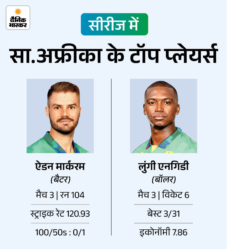 अब तक हुए 23 टी-20 में साउथ अफ्रीका की ओर से कप्तान ऐडन मार्करम टॉप रन स्कोरर हैं। उनके नाम 104 रन हैं। इस दौरान उन्होंने एक अर्धशतक भी लगाया है। गेंदबाजी में लुंगी एनगिडी ने टीम के लिए अहम भूमिका निभाई है। उन्होंने 3 मैचों में 56 विकेट लिए हैं।