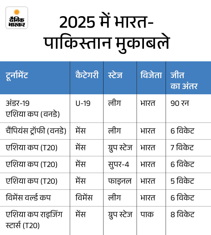 इस साल 6 बार भारत ने पाकिस्तान को हराया 2025 में भारत और पाकिस्तान के बीच कुल सात मुकाबले खेले गए। अंडर-19 एशिया कप (वनडे) के लीग मैच में भारत ने पाकिस्तान को 90 रन से हराया। इससे पहले मेंस चैंपियंस ट्रॉफी (वनडे) के लीग मुकाबले में भारत ने 6 विकेट से जीत दर्ज की। एशिया कप (T20) में दोनों टीमें तीन बार आमने-सामने आईं, जहां ग्रुप स्टेज में भारत ने पाकिस्तान को 7 विकेट से हराया, सुपर-4 में 6 विकेट से जीत हासिल की और फाइनल में 5 विकेट से मुकाबला अपने नाम कर ट्रॉफी जीती।