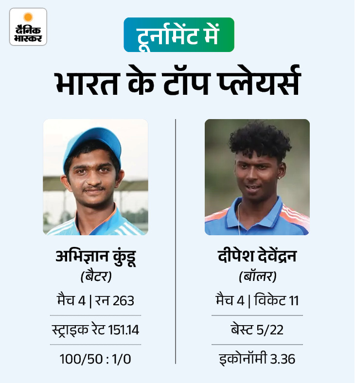 मिडिल ऑर्डर में आरोन जॉर्ज भारत की सबसे बड़ी ताकत बनकर उभरे हैं। उन्होंने लगातार तीन अर्धशतक लगाए हैं। उनके साथ विहान मल्होत्रा ने भी अहम योगदान दिया है। ऑलराउंडर कनिष्क चौहान ने फिनिशर की भूमिका में तेज रन बनाए हैं और गेंद से भी असर डाला है। ग्रुप स्टेज में पाकिस्तान के खिलाफ उनका 3/33 का प्रदर्शन खास रहा।