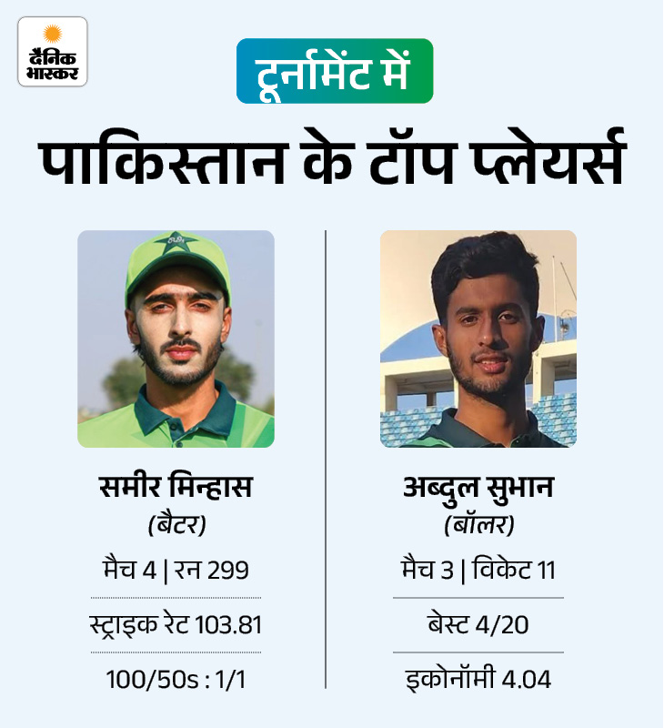 समीर मिन्हास टूर्नामेंट के टॉप स्कोरर पाकिस्तान की सबसे बड़ी ताकत उसकी तेज गेंदबाजी रही है, लेकिन बल्लेबाजी टीम की कमजोरी के रूप में सामने आई है। पूरे टूर्नामेंट में पाकिस्तान की टीम लगातार रन बनाने के लिए संघर्ष करती नजर आई है। कप्तान फरहान यूसुफ की अगुआई वाली टीम फाइनल में भारत के खिलाफ पिछली हार का बदला लेने के इरादे से उतरेगी।