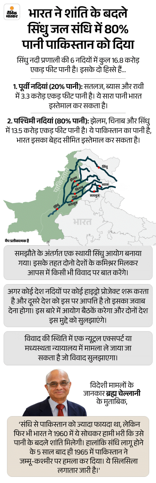 इसके तहत सिंधु वाटर सिस्टम की 3 पूर्वी नदियों का पानी भारत इस्तेमाल कर सकता है और बाकी 3 पश्चिमी नदियों के पानी पर पाकिस्तान को अधिकार दिया गया था।