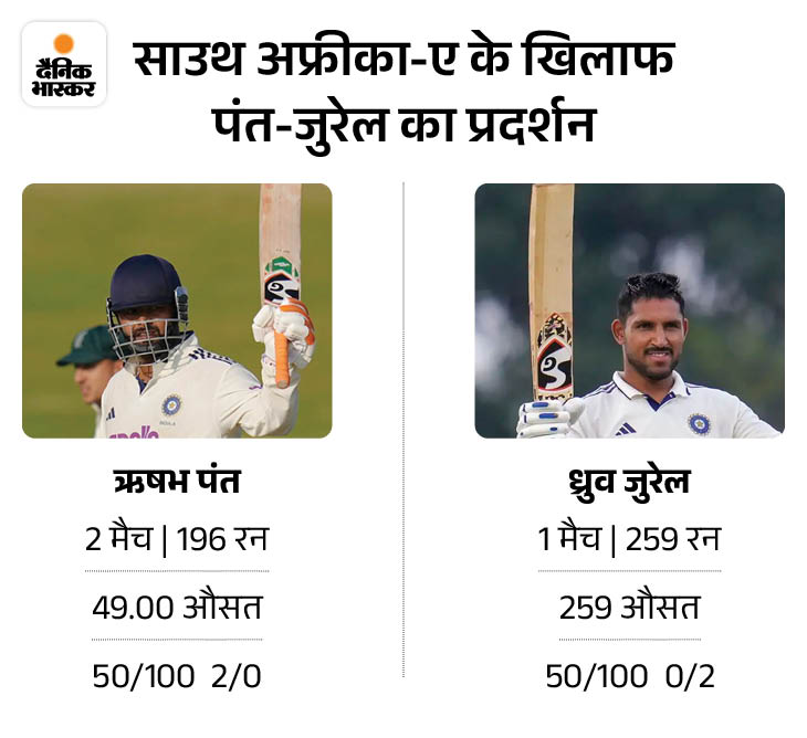 6. ऋषभ पंत की वापसी, ध्रुव जुरेल शानदार फॉर्म में भारतीय टीम में विकेटकीपर बल्लेबाज ऋषभ पंत की वापसी हो रही है। ध्रुव जुरेल भी अच्छी फॉर्म में हैं। दोनों ही बैटर्स ने साउथ अफ्रीका ए के खिलाफ 2 अनऑफिशियल टेस्ट की सीरीज में शानदार प्रदर्शन किया है। पंत ने 2 मैचों में 2 अर्धशतकों के सहारे 196 रन बनाए हैं। जबकि, ध्रुव जुरेल 2 शतकों के सहारे 259 रन बनाए। वे सीरीज के टॉप स्कोरर हैं।