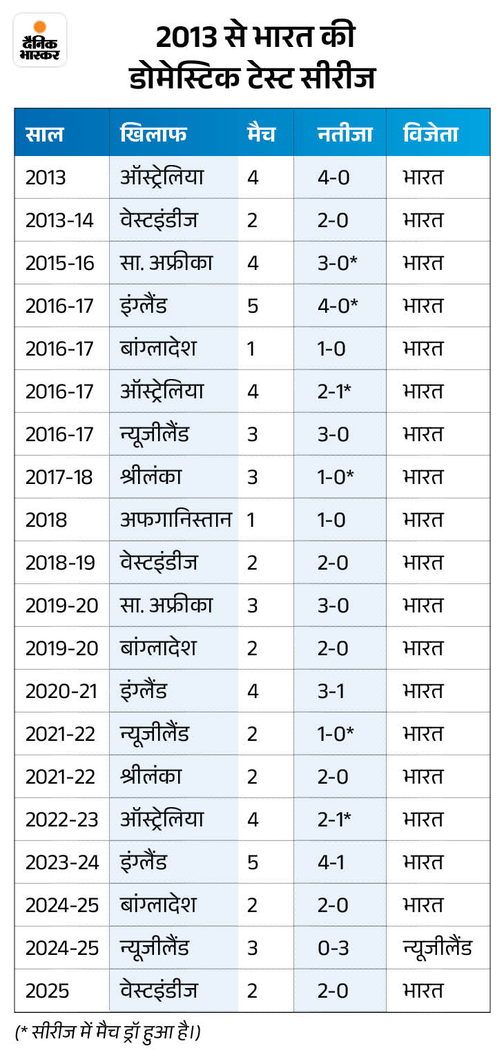 5. भारतीय टीम का घरेलू पिचों पर मजबूत प्रदर्शन भारत के नाम अपने घरेलू मैदान पर सबसे ज्यादा लगातार टेस्ट सीरीज जीतने का वर्ल्ड रिकॉर्ड है। टीम ने 2012 से 2024 तक लगातार 18 टेस्ट सीरीज में जीत हासिल की थी। इस विजय अभियान को न्यूजीलैंड ने पिछले साल रोका था। तब भारतीय टीम को 0-3 से क्लीन स्वीप झेलनी पड़ी। भारतीय टीम ने पिछले महीने वेस्टइंडीज के खिलाफ 2 मैचों की सीरीज में क्लीन स्वीप किया था।