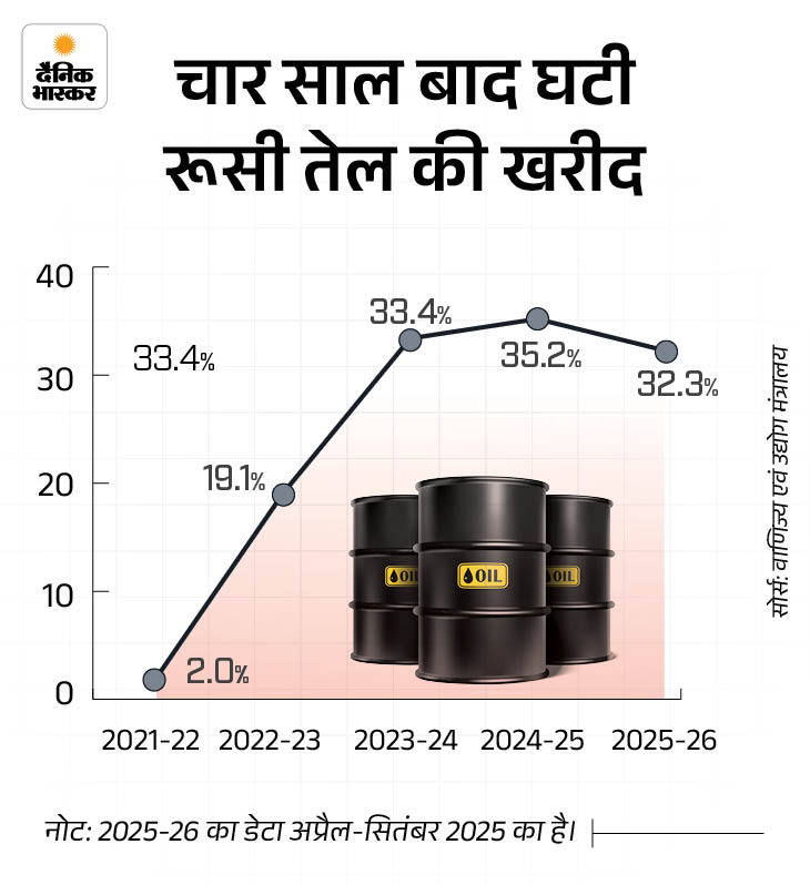 रिपोर्ट के मुताबिक नवंबर 2025 में भारत का रूसी तेल आयात छह महीने के उच्च स्तर पर पहुंच गया था। उस महीने भारत ने रूस से 77 लाख टन तेल खरीदा था, जो कुल आयात का 35% से ज्यादा था।