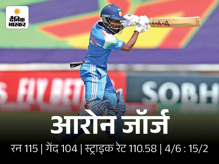 भारतीय ओपनर आरोन जॉर्ज ने 37वें ओवर में शतक पूरा किया। उन्होंने 95 बॉल पर सेंचुरी लगाई।