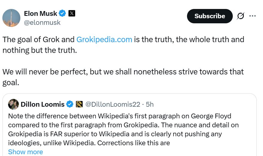 मस्क का AI-पावर्ड ग्रोकिपीडिया लॉन्च होते ही क्रैश: विकिपीडिया को टक्कर देने का दावा, मस्क बोले- ये ट्रुथफुल और बायस-फ्री
