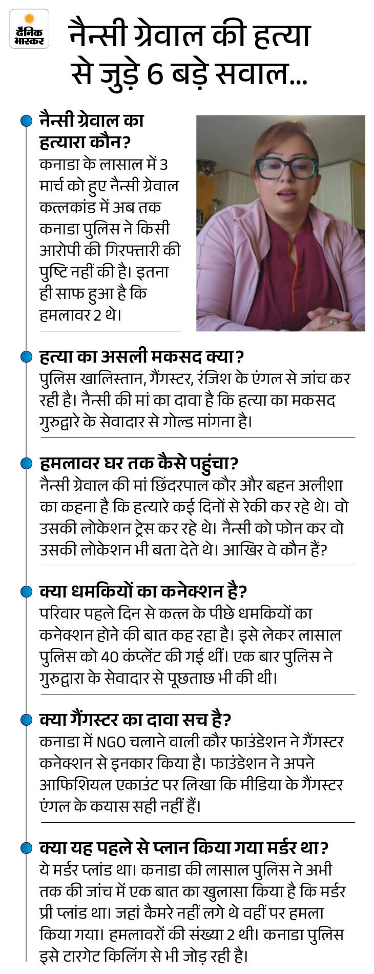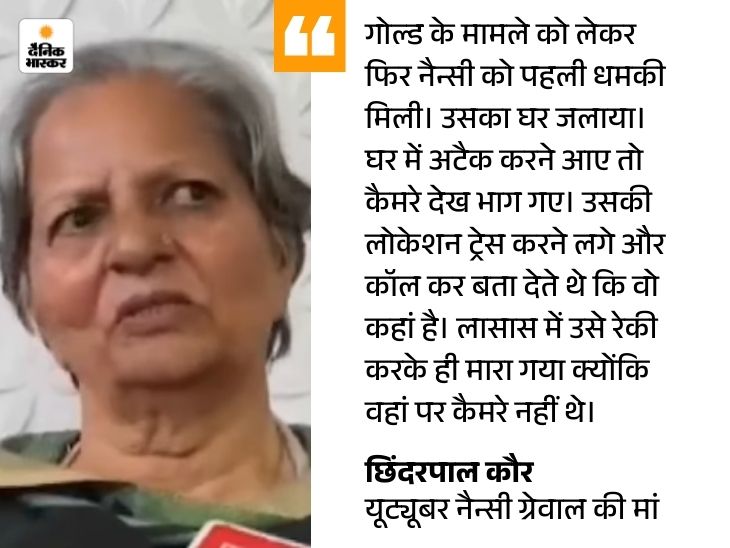 इसी बीच नैन्सी ग्रेवाल की मां ने दावा किया कि उसे बेटी के कातिलों के बारे में पता है, लेकिन नाम नहीं बताना चाहती। उन्होंने कहा- मुझे कनाडा में बेटी के घर में रहना है। नाम बताऊंगी तो वे मुझे भी मार देंगे। मां ने ये जरूर बताया कि नैन्सी की हत्या गोल्ड के झगड़े में हुई है।