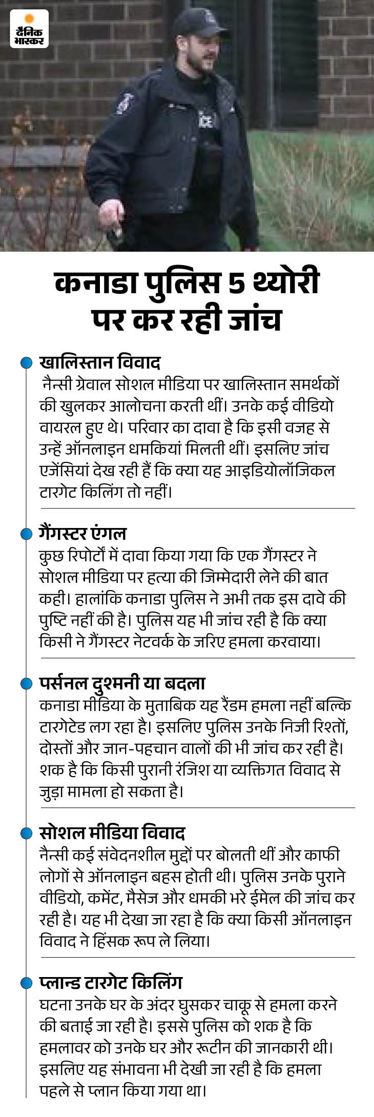 हरियाणा में जन्मी पंजाबी यूट्यूबर नैन्सी ग्रेवाल के कत्ल को एक हफ्ता बीत चुका है लेकिन कनाडा पुलिस अभी तक किसी को अरेस्ट नहीं कर पाई है। हालांकि कनाडा पुलिस खालिस्तानी, गैंगस्टर, निजी रंजिश और क्लाइंट मैटर समेत कई एंगल से इसकी जांच कर रही है।