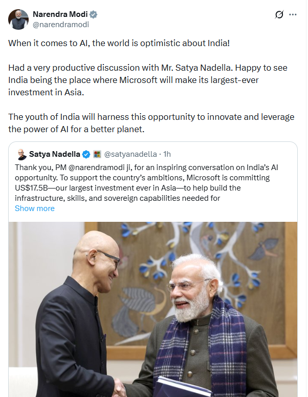 जब भी AI की बात आती है तो पूरी दुनिया भारत की ओर उम्मीद से देखती है। सत्या नडेला जी से पॉजिटिव बातचीत हुई।खुशी हुई कि माइक्रोसॉफ्ट अपना एशिया में अब तक का सबसे बड़ा निवेश भारत में ही करने जा रही है। भारत का युवा इस मौके को हाथ से जाने नहीं देगा। नई-नई चीजें बनाएगा और AI की ताकत से पूरी दुनिया को और बेहतर बनाएगा।