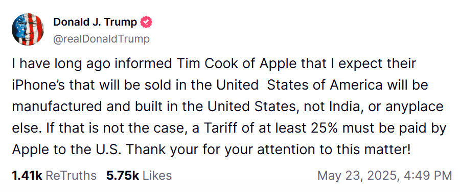 ट्रम्प ने एपल पर 25% टैरिफ लगाने की धमकी दी थी