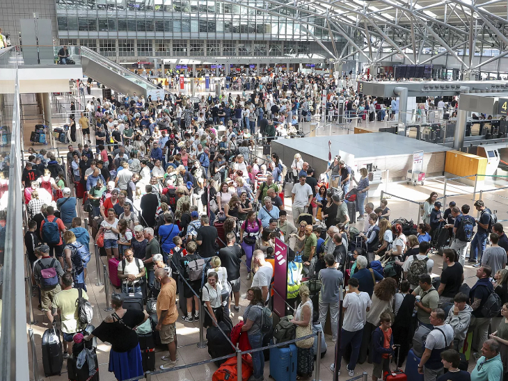 तस्वीरें 19 जुलाई की आइंडहॉवन नीदरलैंड की हैं। माइक्रोसॉफ्ट आउटेज से दुनियाभर में इसी तरह एयरपोर्ट पर भारी भीड़ देखी गई थीं।