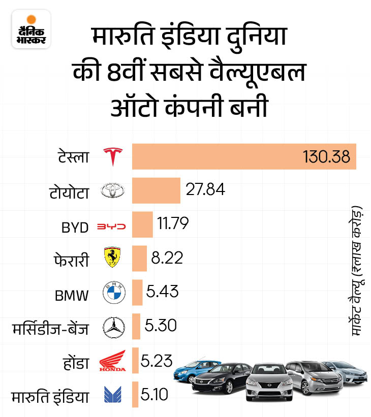 Source: https://www.bhaskar.com/business/news/maruti-becomes-8th-most-valuable-carmaker-globally-with-57-bn-valuation-136018982.html