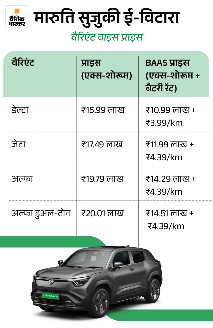 इलेक्ट्रिक SUV में 360 डिग्री कैमरा, एयरबैग और लेवल-2 एडवांस ड्राइविंग असिस्टेंस सिस्टम (ADAS) जैसे सेफ्टी फीचर्स दिए गए हैं। इसकी शुरुआती एक्स-शोरूम कीमत ₹15.99 लाख रुपए रखी गई है। वहीं, BAAS प्रोग्राम के तहत बिना बैटरी के कार ₹10.99 लाख में खरीद सकेंगे। इसे मारुति के प्रीमियम नेक्सा शोरूम के जरिए बेचा जाएगा।