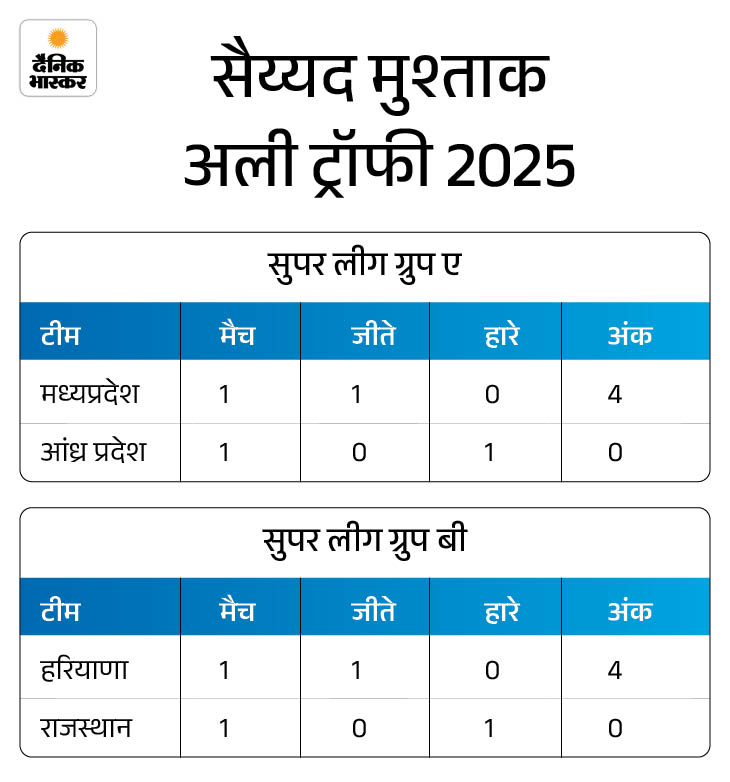 मुश्ताक अली ट्रॉफी में नीतीश रेड्डी की हैट्रिक: मध्यप्रदेश फिर भी जीता; हरियाणा ने राजस्थान को हराया