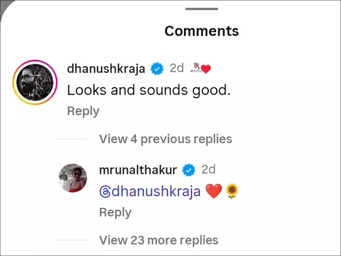 इस कमेंट के बाद सोशल मीडिया पर एक बार फिर चर्चा शुरू हो गई कि धनुष और मृणाल ठाकुर एक-दूसरे को डेट कर रहे हैं। इससे पहले भी दोनों की डेटिंग की खबरें इसी साल अगस्त में फिल्म सन ऑफ सरदार 2 के प्रीमियर के दौरान सामने आई थीं। इसके अलावा धनुष की फिल्म तेरे इश्क में’ की रैप-अप पार्टी में भी मृणाल ठाकुर नजर आई थीं। हालांकि, अब तक दोनों की तरफ से इस मामले कोई रिएक्शन सामने नहीं आया है।