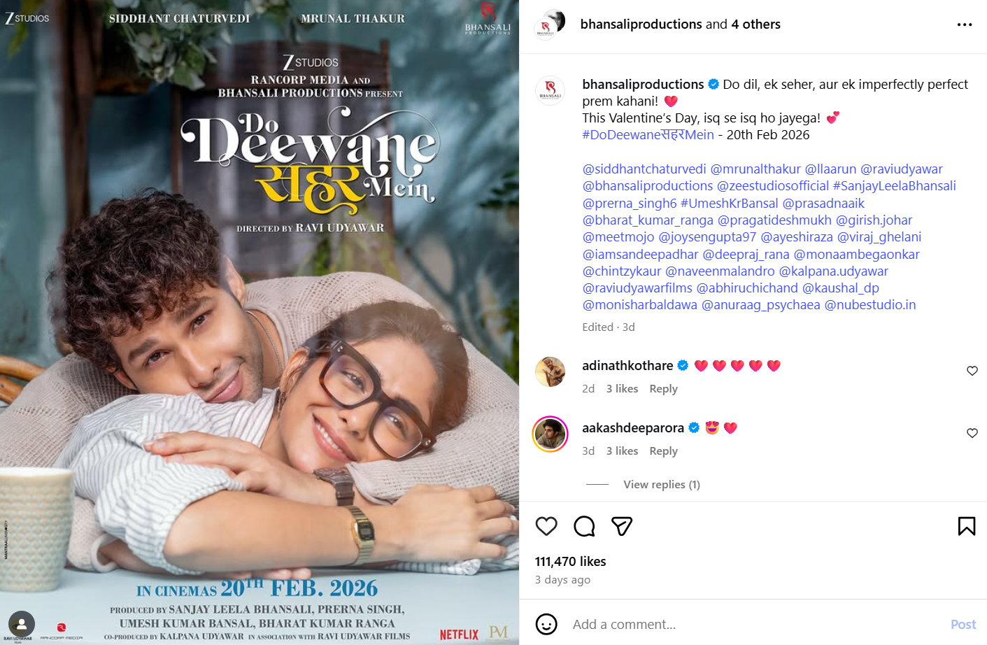 बता दें, फिल्म दो दीवाने सहर की घोषणा करते हुए मेकर्स ने कैप्शन में लिखा, दो दिल, एक सहर और एक पूरी तरह से परफेक्ट प्रेम कहानी। इस वैलेंटाइन डे इश्क से इश्क हो जाएगा। साथ ही मेकर्स ने यह भी बताया कि फिल्म 20 फरवरी 2026 को रिलीज होगी।