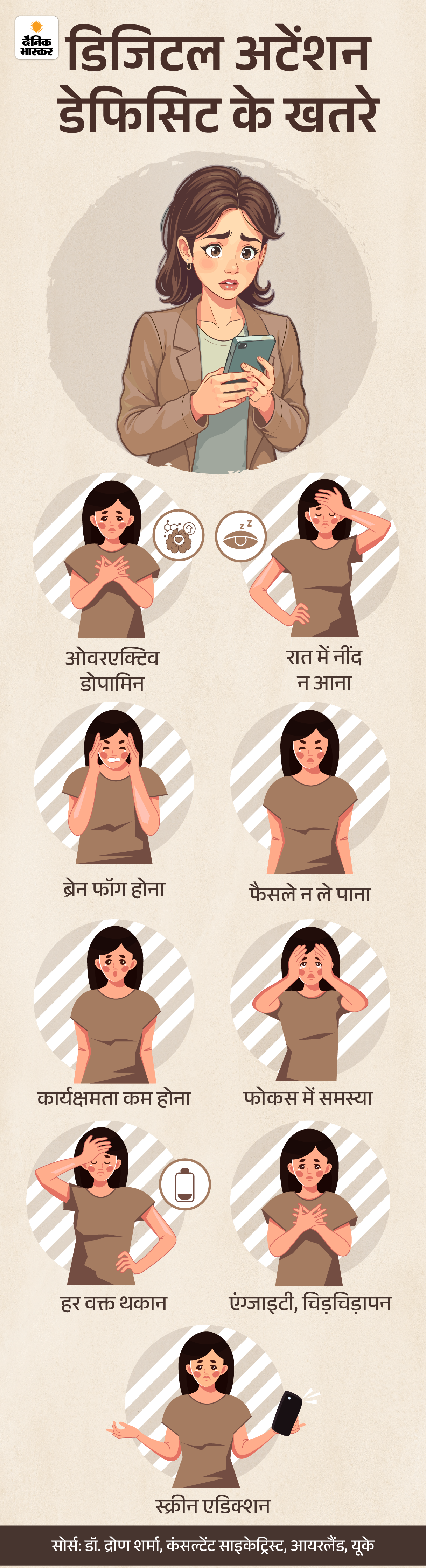 आपका अनुभव दरअसल DADS (डिजिटल इरा अटेंशन डेफिसिट सिंड्रोम) से मेल खाता है। यह समस्या फोकस की कमी और नींद न आने से जुड़ी हुई है। इसका संबंध बहुत ज्यादा डिजिटल कंजम्पशन से है। लगातार स्क्रीन देखते रहने और ऑनलाइन कंटेंट कंज्यूम करने के कारण नर्वस सिस्टम हमेशा उत्तेजित रहता है, जिसके कारण यह समस्या पैदा होती है।