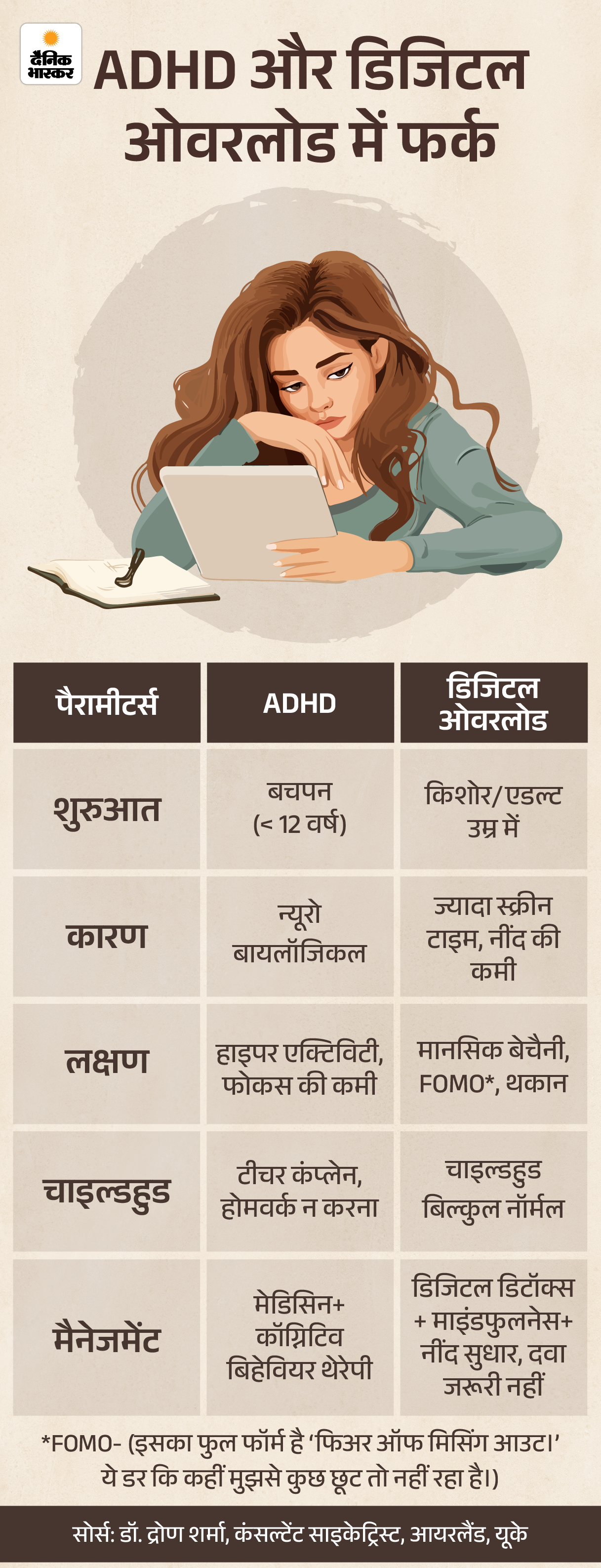 जो समस्याएं डिजिटल ओवरलोड के कारण पैदा हो रही हैं, उसे अक्सर लोग ADHD (अटेंशन डेफिसिट हाइपरएक्टिविटी डिसऑर्डर) से जोड़कर देखने लगते हैं। लेकिन यह डाइग्नोसिस सही नहीं है। समस्या की सही पड़ताल करने के लिए दोनों के फर्क को समझना जरूरी है। नीचे ग्राफिक में देखिए कि ADHD और डिजिटल ओवरलोड में क्या अंतर है।