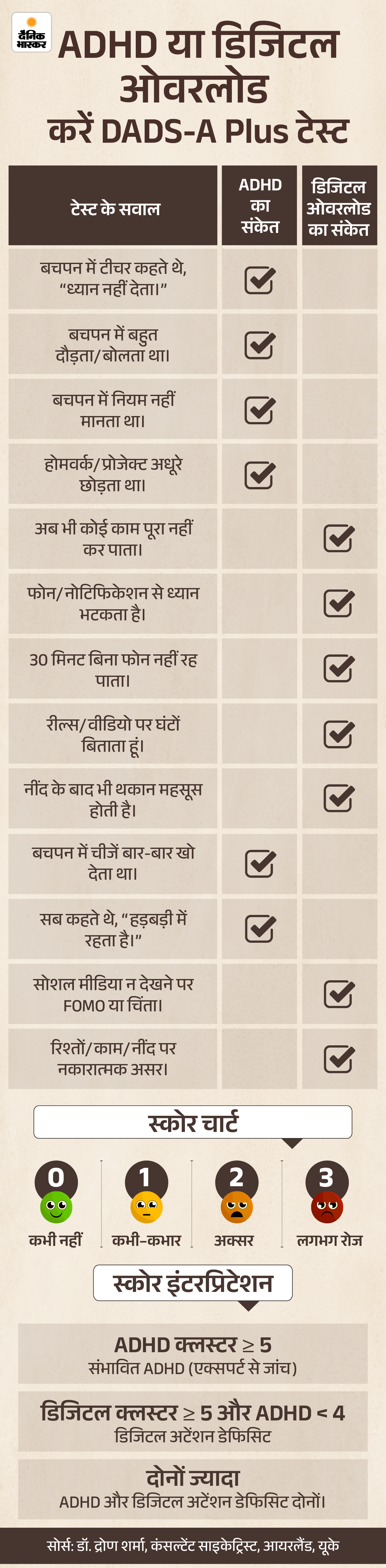 नंबर के हिसाब से उसका इंटरप्रिटेशन भी ग्राफिक में दिया है। ADHD क्लस्टर से जुड़े सवालों में अगर आपका स्कोर 5 से ज्यादा है तो ADHD की संभावना हो सकती है। ऐसे में एक्सपर्ट से जांच कराना जरूरी है। वैसे ही अगर डिजिटल क्लस्टर के सवालों में आपका स्कोर 5 से ज्यादा है, लेकिन ADHD क्लस्टर के सवालों में 4 से कम है तो आपकी समस्या डिजिटल अटेंशन डेफिसिट की है। ऐसे में स्क्रीन टाइम को कम करने से मदद मिलेगी। बाकी डिटेल नीचे ग्राफिक में देखें और अपना स्कोर एनालिसिस करें।