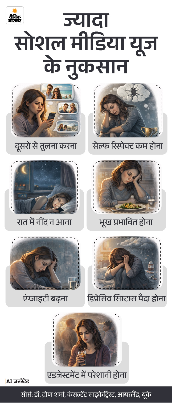 सोशल मीडिया का बहुत ज्यादा इस्तेमाल इसलिए खतरनाक है क्योंकि मेंटल, इमोशनल और हेल्थ संबंधी समस्याएं हो सकती हैं। इससे सिर्फ सेल्फ वर्थ ही कम नहीं होती बल्कि नींद, भूख जैसे बेसिक हेल्थ पैरामीटर्स पर भी इसका नेगेटिव प्रभाव पड़ता है। डिटेल नीचे ग्राफिक में देखें-