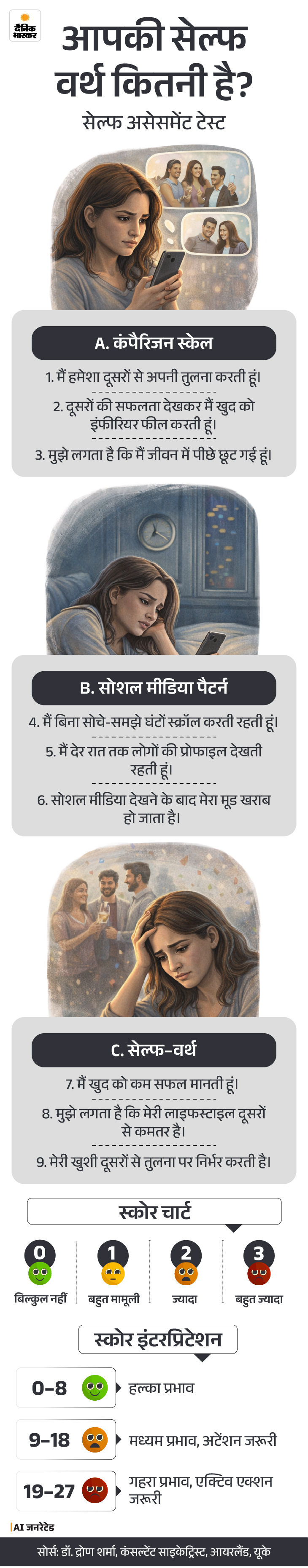 नंबर के हिसाब से उसका इंटरप्रिटेशन भी ग्राफिक में दिया है। अगर आपका टोटल स्कोर 0 से 8 के बीच में है तो ये सामान्य हल्का प्रभाव है। लेकिन अगर आपका स्कोर 19 से 27 के बीच है तो कंपैरिजन स्केल पर आपका स्कोर बहुत ज्यादा है। आप बहुत ज्यादा तुलना करती हैं और आपकी सेल्फ वर्थ कम है। ऐसे में आपको एक्टिव कदम उठाने की जरूरत है।