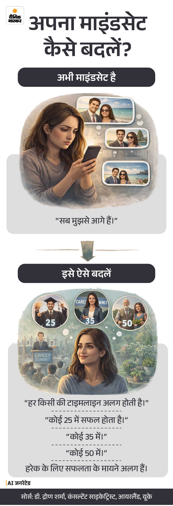 जवाब- आप जो महसूस कर रही हैं, वह बहुत रियल और कॉमन है, खासतौर पर आज के सोशल मीडिया दौर में। अच्छी बात यह है कि ये कोई स्थायी समस्या नहीं है। यह एक समझने और बदलने योग्य पैटर्न है। मैं साइकोलॉजी के कुछ टूल्स और फ्रेमवर्क्स की मदद से आपको एक प्रैक्टिकल रोडमैप देने की कोशिश करूंगा।