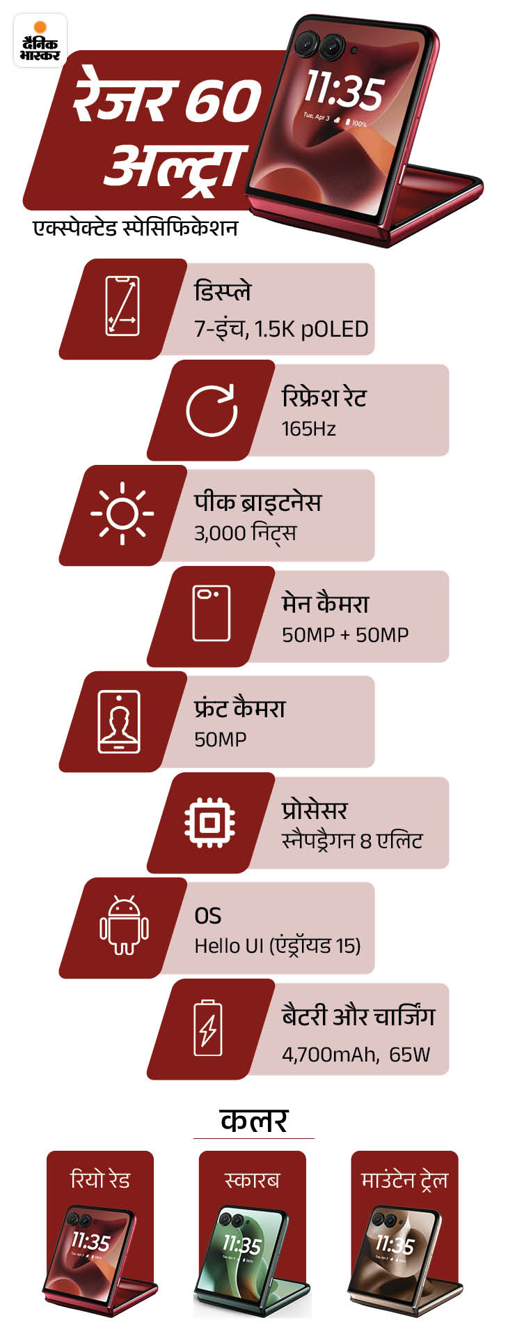 मोटोरोला रेजर 60 अल्ट्रा 13 मई को लॉन्च होगा: 4-इंच एक्सटर्नल डिस्प्ले के साथ स्नैपड्रैगन 8 एलिट चिपसेट और 50MP ट्रिपल कैमरा; एक्सपेक्टेड प्राइस ₹99,000