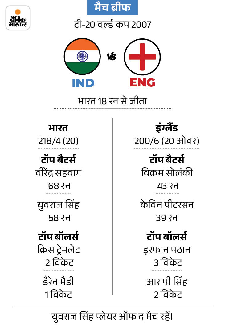 साउथ अफ्रीका में खेले गए 2007 टी20 वर्ल्ड कप के उस मैच में भारत ने पहले बल्लेबाजी करते हुए 18 ओवर तक 171 रन बनाए थे। 19वें ओवर से पहले युवराज और फ्लिंटॉफ के बीच तीखी बहस हुई। दोनों ने एकदूसरे से कुछ कड़े शब्द बोले। इसके बाद गुस्से में आए युवराज ने इंग्लिश गेंदबाज स्टुअर्ट ब्रॉड के एक ओवर में छह छक्के जड़ दिए। भारत ने 20 ओवर में 218/4 रन बनाए और 18 रन से मैच जीत लिया। बाद में यही टीम वर्ल्ड कप की पहली चैंपियन भी बनी।