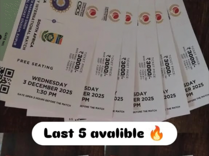 भारत और साउथ अफ्रीका के बीच ODI मैच आज दोपहर 1:30 बजे रायपुर इंटरनेशनल क्रिकेट स्टेडियम में खेला जाएगा। मैच से पहले टिकट की ब्लैक मार्केटिंग जोरों पर है। सोशल मीडिया से लेकर प्राइवेट अस्पतालों तक टिकट खुलेआम दोगुने दाम पर बेचे जा रहे हैं। पढ़ें पूरी खबर