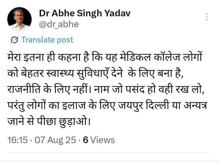 पहली पोस्ट में बगैर नाम लिए अहीर ठेकेदार बताया डॉ. अभय यादव ने अपने ऑफिशियल सोशल मीडिया X हैंडल से पहली पोस्ट 7 अगस्त को शाम 4ः15 बजे की। इसमें लिखा- जहां तक अहीर समाज के ठेकेदारों का प्रश्न है, उनका अगर असली चेहरा देखना है तो नांगल चौधरी के पिछले विधानसभा चुनावों का विवरण किसी गांव में पूछ लें। स्वयं से असुरक्षित इन छोटे दिल के बड़े लोगों के लिए महानायक राव तुलाराम केवल राजनीतिक कवच हैं। जिन्हें सुविधानुसार पहनते हैं।