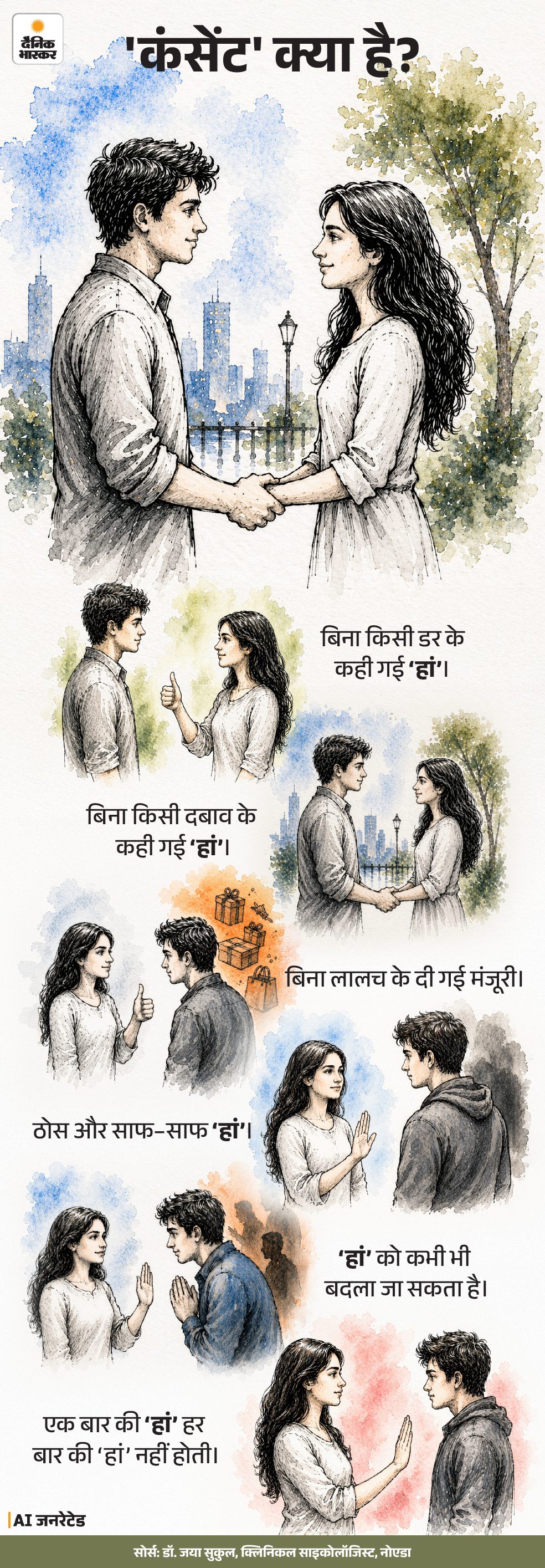 किसी भी रिश्ते में कंसेंट यानी सहमति को सही तरीके से समझना बहुत जरूरी है। यह सिर्फ एक बार ‘हां’ कहने तक सीमित नहीं होता। इसमें अपनी मर्जी, सहजता और कभी भी फैसला बदलने का हक शामिल है। आइए ग्राफिक के जरिए समझते हैं कि कंसेंट का असली मतलब क्या है।